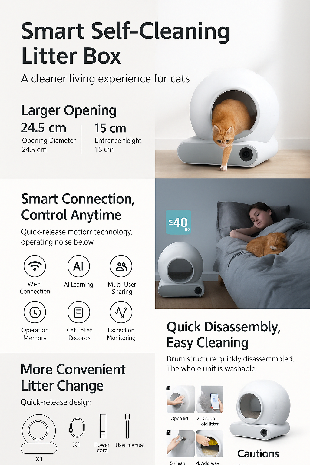 How can you do all that easily?That’s where the smart cat litter box comes in. It takes away your worries.What Can a Smart Cat Litter Box Do for You?Automatic cleaning · Deodorization · App monitoringThe smart cat litter box is an innovative pet product powered by artificial intelligence.It automatically separates and disposes of your cat’s waste and clumped litter into a waste compartment — completely hands-free.Moreover, it’s also equipped with multiple safety sensors, ensuring that it never rotates or cleans while your cat is still inside,effectively protecting their safety.